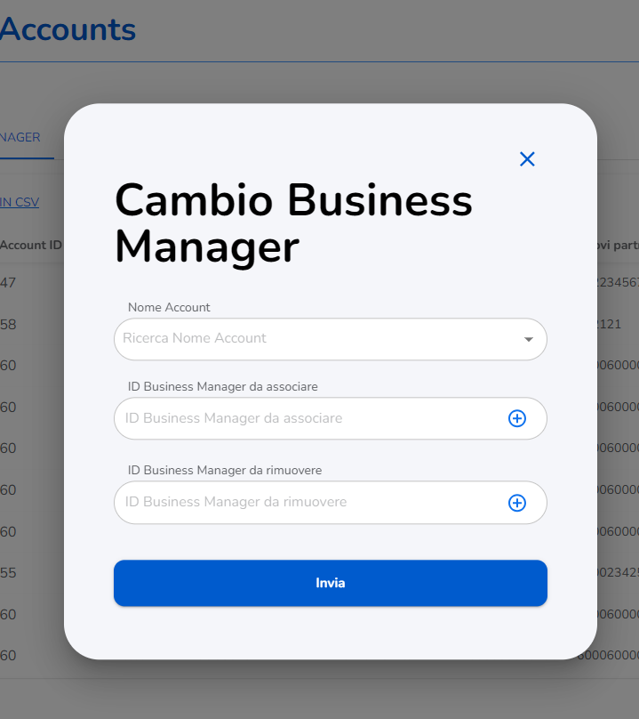 In questo campo, puoi cercare e selezionare l'account per il quale desideri effettuare il cambio del Business Manager. Una volta selezionato l'account, la richiesta verrà associata a quell'ID.